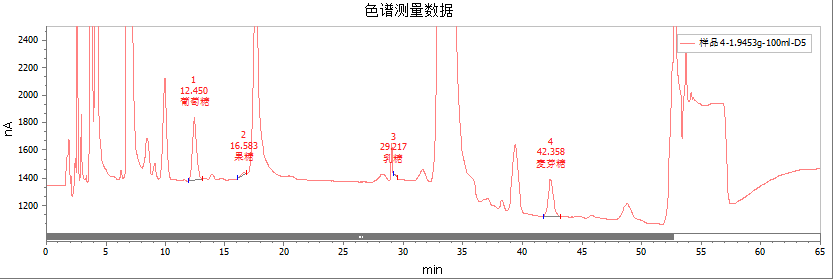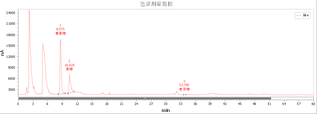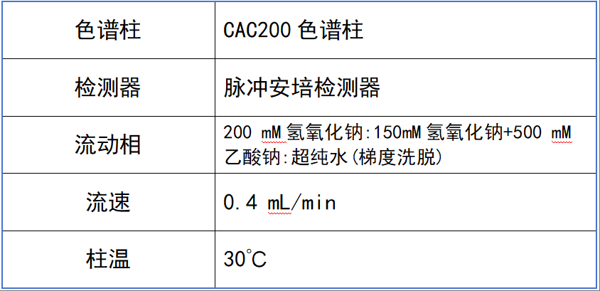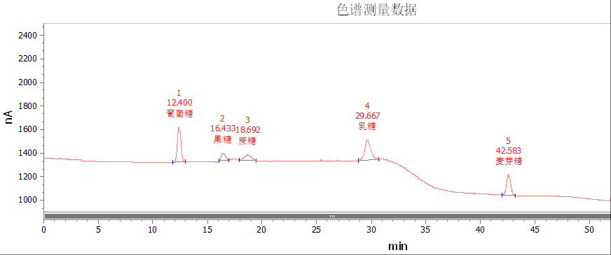 新標(biāo)準(zhǔn)要求明確標(biāo)示糖含量 哪種檢測(cè)方法能精準(zhǔn)檢測(cè)糖含量呢? GB 5009.8-2023《食品安全國(guó)家標(biāo)準(zhǔn)食品中果糖、葡萄糖、蔗糖、麥芽糖、乳糖的測(cè)定》明確了食品中五種糖的檢測(cè)方法,其中離子色譜法作為第二法適用于全品類食品果糖、葡萄糖、蔗糖、麥芽糖、乳糖的測(cè)定,是應(yīng)用范圍最廣的檢測(cè)方法。 盛瀚解決方案 儀器配置: CIC-D200E糖檢測(cè)專用儀 ?高通量自動(dòng)進(jìn)樣器 60、120位進(jìn)樣器可選,樣品處理量多,效率更高; 全定量、部分進(jìn)樣、無(wú)損進(jìn)樣等多種進(jìn)樣方式可選,滿足不同用戶使用場(chǎng)景。 ?電化學(xué)檢測(cè)單元 直流、脈沖、積分三種模式可選,選擇更靈活; 內(nèi)置柱溫箱,連接死體積更小,出峰分辨率更佳; ?高效梯度混合泵 多通路流路自動(dòng)混合,精度高、易控制、更省心; 耐腐蝕,流路pH范圍0~14,可適用多種有機(jī)溶劑,性能優(yōu)異。 SH-CAC-200 色譜柱可以快速高效地分離單糖、雙糖,具有理想的分離度;與脈沖安培檢測(cè) (PAD) 相結(jié)合,在高 pH 條件下可進(jìn)行高分辨率的分離,無(wú)需衍生化。 前處理方法: ①稱取試樣2g(精確至0.001 g)于100 mL比色管中,加入約50 mL 50℃~60℃熱水,渦旋或攪拌 ②待樣品充分溶解,加入2 mL乙酸溶液,渦旋混勻,超聲30 min ③轉(zhuǎn)移至100 mL容量瓶中并用水定容至刻度,混勻,靜置20 min ④依次過(guò)0.45 μm水性濾膜針頭過(guò)濾器和C18固相萃取小柱 色譜條件: 樣品譜圖: (標(biāo)準(zhǔn)溶液譜圖 點(diǎn)擊圖片可放大查看) (樣品1溶液譜圖 點(diǎn)擊圖片可放大查看) (樣品2局部放大譜圖 點(diǎn)擊圖片可放大查看)