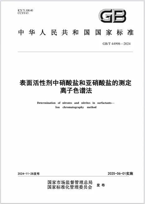 “致癌物前體”硝酸鹽和亞硝酸鹽 有何危害? 硝酸鹽和亞硝酸鹽是潛藏在日化產(chǎn)品中的“隱形健康殺手”。亞硝酸鹽(NO??)的危害尤為突出: 血液毒性:亞硝酸鹽能與血紅蛋白結(jié)合,形成高鐵血紅蛋白,導(dǎo)致血液失去攜氧能力,引發(fā)頭暈、呼吸困難甚至窒息。 為全面提升表面活性劑產(chǎn)品質(zhì)量管控,保障日化用品健康安全,由盛瀚參與起草的國(guó)家標(biāo)準(zhǔn)GB/T 44998-2024《表面活性劑中硝酸鹽和亞硝酸鹽的測(cè)定 離子色譜法》將于2025年6月1日正式實(shí)施。 該標(biāo)準(zhǔn)針對(duì)氧化胺類、烷醇酰胺類等表面活性劑產(chǎn)品,通過(guò)高靈敏度、高準(zhǔn)確度的離子色譜法,建立硝酸鹽和亞硝酸鹽含量的精準(zhǔn)測(cè)定體系,為表面活性劑原料質(zhì)量控制及終端產(chǎn)品(如化妝品、洗滌劑)的安全性評(píng)估提供科學(xué)依據(jù),助力企業(yè)提升產(chǎn)品質(zhì)量和安全性。